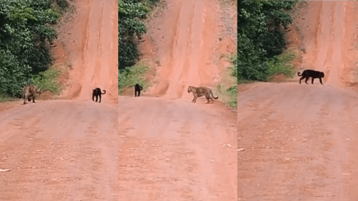 O motorista ficou assustado ao ver de longe a cabeça da onça-preta e imediatamente parou a moto para observar seus movimentos. O felino saiu da mata e atravessou a estrada, seguida por outra onça maior e com pintas. Veja o vídeo: