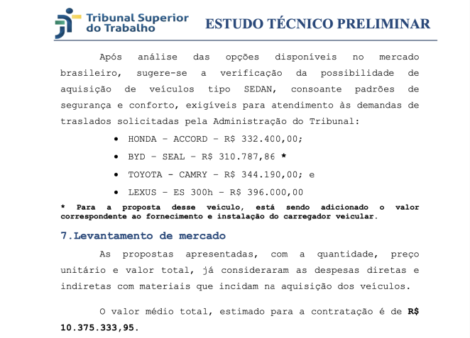 Em um estudo técnico do Tribunal, outros modelos também foram cogitados para compra, como o Honda Accord, BYD Seal e o Toyota Camry. No caso do Seal, o TST ainda justifica no documento que o valor também corresponde ao fornecimento e instalação do carregador veicular.