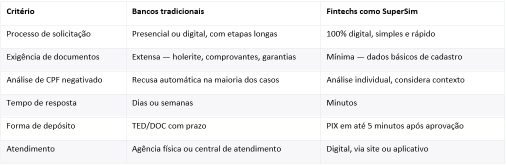 A tabela abaixo resume as principais diferenças entre o modelo bancário convencional e o modelo adotado por fintechs como a SuperSim: