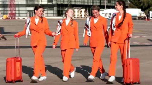 O novo uniforme da SkyUp para mulheres agora inclui tênis Nike brancos e um terno laranja solto, com calças e um lenço de seda, ambos fabricados por marcas ucranianas. As camisetas brancas substituirão as blusas.