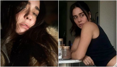 Em alguns dos cliques, a atriz usa uma regata e lingerie preta, com renda branca.