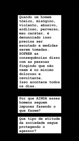 "Quando um homem tóxico, misógino, violento, abusivo, ardiloso, perverso, mau caráter... é denunciado, isso precisa ser escutado e medidas serem tomadas. Sofrer as consequências disso com as pessoas fingindo que não veem é no mínimo doloroso e revoltante. Isso acontece todos os dias", começou ela sem citar ou fazer qualquer menção ao ator.