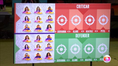 As três emparedadas, Alane, Beatriz e Pitel, e a Líder Giovanna precisaram escolher um participante para defender e outro para criticar na dinâmica