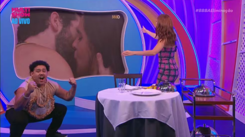 Ana Clara, que apresentava o quadro "BBB - A Eliminação" flagrou o momento em um telão atrás deles e menciona: "Beijaram!". Logo depois, o capoeirista, que estava comendo, se levanta e fala: "Beijou! Beijou!". A apresentadora então começa a bater palmas e diz: "Finalmente, meu Deus".