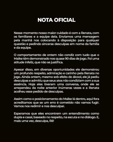 Em outro trecho, também ressaltaram que o jogador já se desculpou com a bailarina e suas palavras foram acolhidas pela jovem. "Assim como o posicionamento do Maike lá dentro, aqui fora acreditamos que se um erro é cometido não vamos fugir. Vamos nos redimir e nos desculpar", acrescentaram.