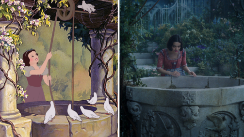 Além disso, é neste momento que Branca de Neve encontra com o príncipe pela primeira vez no filme de 1937 e assustada, sai correndo. Já no live-action, esse encontro não acontece.