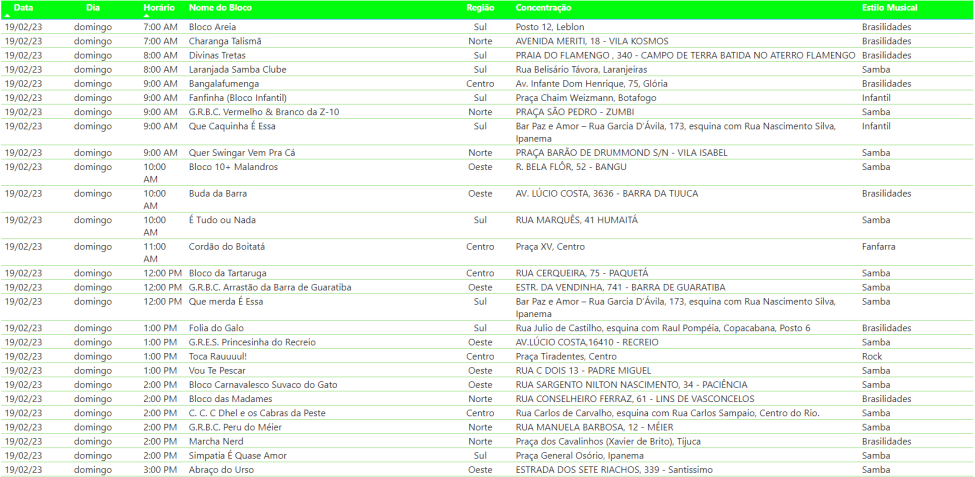A estudante de Economia da Universidade Federal Fluminense (UFF) Wendela Sara Leite desenvolveu, através do software Power BI da Microsoft, um projeto para visualização do calendário de blocos previstos para o Rio de Janeiro e Sâo Paulo.