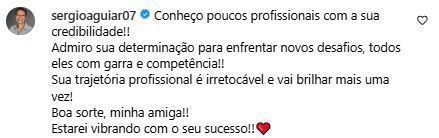 "Sua trajetória profissional é irretocável e vai brilhar mais uma vez! Boa sorte, minha amiga! Estarei vibrando com o seu sucesso!", finalizou.