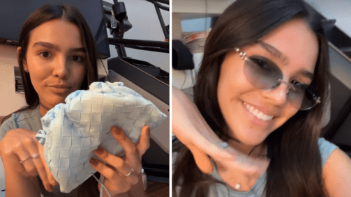 "Vou abrir o presentinho que eu e minha mãe inventamos hoje, juro gente, tô apaixonada nessa bolsa, é a coisa mais linda do mundo", contou ao dizer que nunca teve uma bolsa da Bottega, grife de luxo italiana, que custa R$ 9,5 mil.