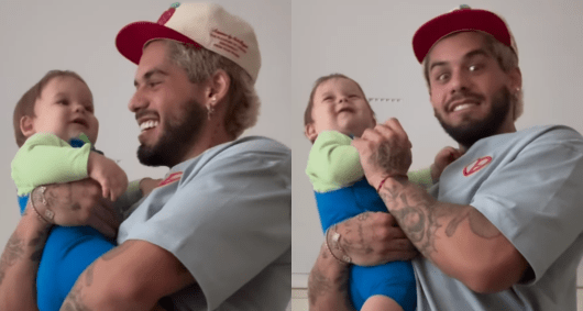 Zé Felipe, 27, aproveitou a noite deste sábado (7) para ensinar o pequeno José Leonardo, de apenas 6 meses, a falar papai pela primeira vez.