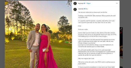 O craque não deixou explícito o motivo do pedido, porém, no fim de semana passado, o jornal "Metrópoles" noticiou que o jogador teria traído a modelo, que está grávida, com uma influenciadora em São Paulo.