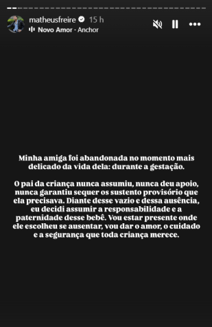 Em uma publicação no seu perfil no Instagram, Matheus revelou que assumiu a paternidade da criança após ver a amiga sendo abandonada durante a gravidez. "Minha amiga foi abandonada no momento mais delicado da vida dela: durante a gestação. O pai da criança nunca assumiu, nunca deu apoio, nunca garantiu sequer o sustento provisório que ela precisava", escreveu.