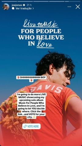 O cantor Joe Jonas, 35, anunciou em suas redes sociais, que fará uma série de shows para divulgar o seu novo álbum de estúdio. O local, no entanto, será definido pelos fãs, que devem votar em sua cidade, para que ela receba a maior quantidade de votos e com isso, seja escolhida pelo músico.