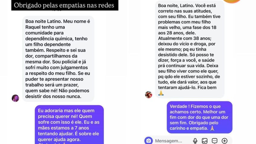 No Instagram, o músico compartilhou prints de algumas mensagens que recebeu de internautas após o desabafo, e agradeceu pelo apoio. "Obrigado pela empatia nas redes", escreveu ele. "Quem sofre com isso é ele. Eu e a mãe estamos tentando ajudar. É sobre ele querer ajuda agora. Obrigado!", disse em resposta a outro seguidor.