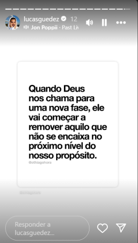 "Quando Deus nos chama para uma nova fase, Ele vai começar a remover aquilo que não se encaixa no próximo nível do nosso propósito", diz o post compartilhado por Lucas Guedez nos stories do Instagram.