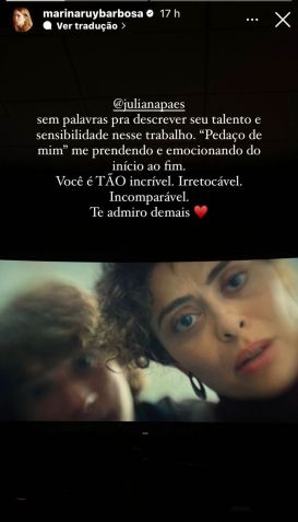 A atriz Marina Ruy Barbosa, 29, usou as redes sociais na terça-feira (9) para enaltecer Juliana Paes, 45, por seu papel em "Pedaço de Mim", nova série da Netflix.