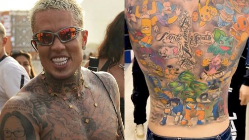 O cantor desenhou vários personagens nas costas, como os personagens de “As Tartarugas Ninja”, o Bob Esponja, Naruto, Pikachu e mais.
