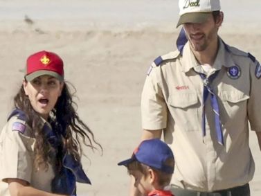 Mila Kunis e Ashton Kutcher limpam praia com jovens vestidos de escoteiros