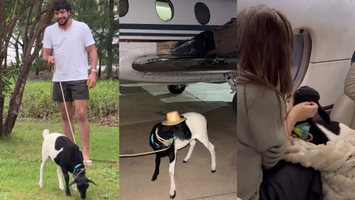 Ele mostrou o animal, que se chama Joaquim, dentro de seu jatinho em baixo de cobertas e recebendo cafuné da ex-BBB enquanto dormia. O artista comentou que o bode é tranquilo e ficou quietinho durante a viagem.