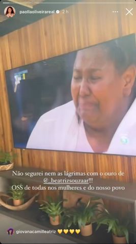 Quem também se emocionou nesta sexta-feira (2) foi a atriz Paolla Oliveira, que disse que "não segurei nem as lágrimas com o ouro de Beatriz Souza!".