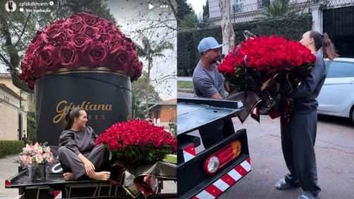 Um grande buquê de rosas vermelhas chegou até a casa da influenciadora em um caminhão no formato de um buquê de rosas.