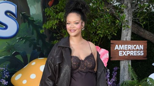 Para a première, a artista optou por um longo vestido preto com um laço verde que ressaltava a barriga da gravidez avançada de seu terceiro bebê com o esposo, A$AP Rocky, além de ter rendas no busto e volume no comprimento. Os pequenos também foram vestidos à rigor para o evento, ambos usando trajes sociais, com gravata e blazer.
