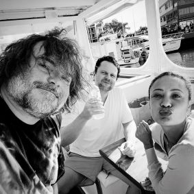 "Isso foi ontem", escreveu ele na legenda da foto, em que aparece em cima de um barco ao lado dos outros dois atores.