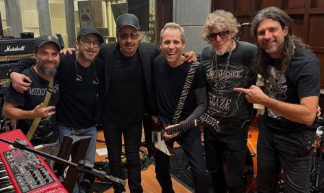 Na foto, Bellotto aparece ao lado de Alexandre de Orio, Beto Lee, Sérgio Britto, Branco Mello e Mario Fabre em um estúdio.
