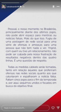 “Pessoal, o nosso momento no Brasileirão, principalmente diante dos últimos jogos, não pode abrir espaço para mentiras ou notícias falsas. Mais do que isso. Fugiu de uma postagem de rede social para uma série de ofensas e ameaças para uma pessoa que não tem nada a ver. Yngrid, com quem eu tive um relacionamento, não pode ser culpada pela nossa frustração de resultados negativos dentro das quatro linhas. É uma questão de respeito”, começou.