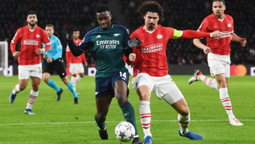 O Arsenal, da Inglaterra, empatou por 1 a 1 com o PSV, da Holanda, nesta terça-feira (12), pela última rodada da fase de grupos da Champions League. O confronto foi realizado no Philips Stadion, em Eindhoven. O atacante Nketiah abriu o placar para os Gunners, mas os donos da casa deixaram tudo igual com Vertessen.