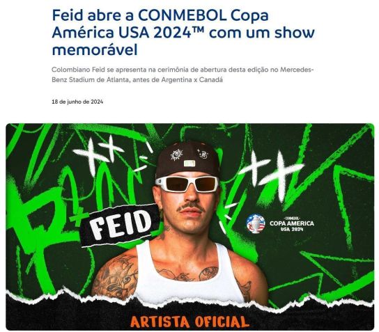 Artista nomeado nove vezes ao GRAMMY Latino e um dos mais bem-sucedidos da música latina internacionalmente, Feid está confirmado como o show de abertura da festa da Copa América, nos Estados Unidos.