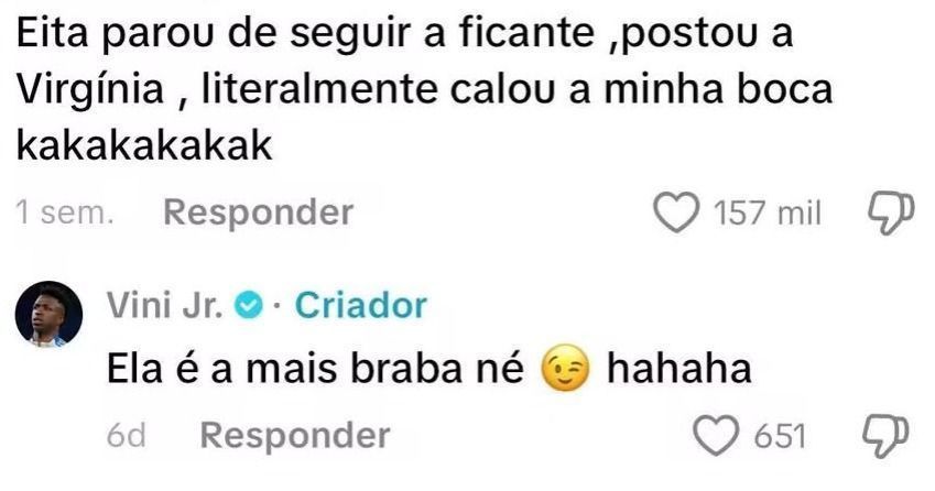 No TikTok, uma seguidora do jogador escreveu: "Eita, parou de seguir a ficante, postou a Virginia, literalmente calou a minha boca (risos)". Logo depois, Vini respondeu exaltando a influenciadora: "Ela é a mais braba, né?".