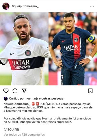 A publicação cita informação de uma reportagem publicada pelo jornal francês L'Equipe. "No verão passado, Kylian Mbappé deixou claro ao PSG que não havia mais espaço para ele e Neymar no mesmo elenco. Por coincidência, no dia que Neymar praticamente foi anunciado no Al-Hilal, Mbappé voltou aos treinos super feliz", diz a página. O post, no Instagram, foi curtido pela conta oficial de Neymar.