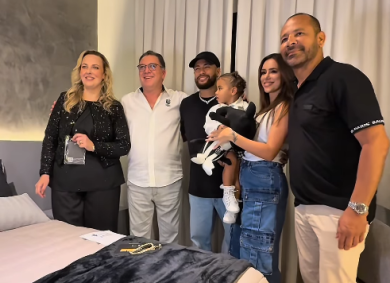Neymar Jr., o pai, Mavie e Bruna Biancardi participaram da cerimônia e visitaram a suíte do camisa 10 do Peixe.