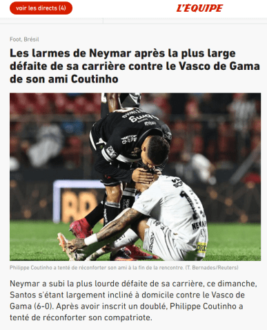 O Francês L'equipe destacou o choro de Neymar após a goleada histórica. "Neymar sofreu a pior derrota de sua carreira neste domingo", escreveu o periódico.