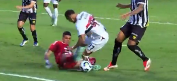 O goleiro do Santos, Gabriel Brazão, dividiu com o meia do São Paulo. Porém, o goleiro santista acertou os dois pés um pouco acima da linha da bola, o que foi interpretado por muitos como pênalti. Veja lance: