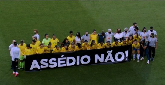 Jogadoras da seleção brasileira entram em campo com faixa: 'assédio não'