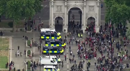 O grupo sairá do Hyde Park e marchará até o Parlamento britânico (cerca de 3 km). Apesar da concentração pacífica, há muitos policiais circulando entre a multidão.