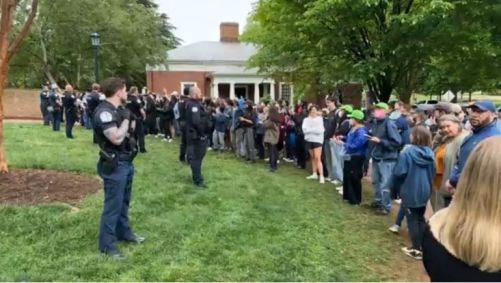 As tensões aumentaram no campus da UVA em Charlottesville, onde os protestos foram em grande parte pacíficos até a manhã de sábado, quando policiais com equipamento de choque foram vistos em um vídeo se movendo em um acampamento no gramado do campus, algemando alguns manifestantes com braçadeiras e usando o que parecia para ser spray químico.