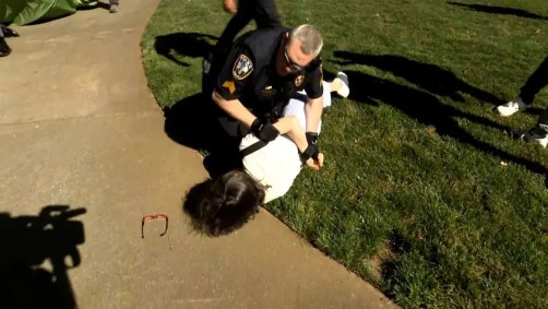 No vídeo do incidente, os óculos de Caroline Fohlin caem quando ela é forçada a deitar na calçada e ela pode ser ouvida dizendo aos policiais: “Você acabou de bater minha cabeça no concreto”. Fohlin foi acusada de conduta desordeira e agressão simples contra um policial.