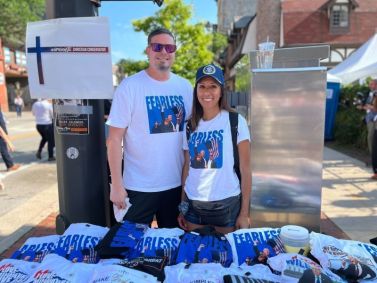 Andrea Neuser e sua família fizeram camisetas para vender na convenção com a palavra “FEARLESS” ("Destemido", em tradução literal) escrita acima da fotografia histórica de Trump.
