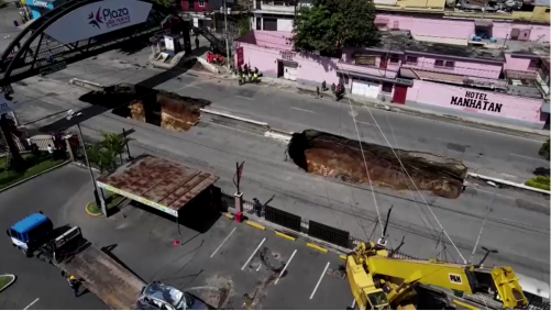 No local existem duas dolinas de 30 metros de diâmetro e 12 e 15 metros de profundidade, respetivamente, segundo os Bombeiros Voluntários. Eles teriam sido causados pelas chuvas intensas que atingiram a Guatemala neste sábado e obrigaram as autoridades a restringir a passagem na área e permitir rotas alternativas.