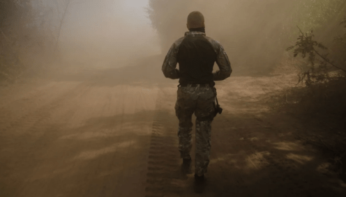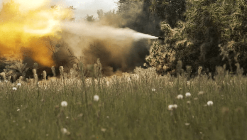 Empurrados de volta para os arbustos, passando por Bradleys (veículos blindados de combate) destruídos e Humvees (utilitários militares) envelhecidos, o tanque T72 da era soviética abaixa seu canhão para disparar. Seus alvos são as posições russas, ameaçadas pelo avanço da Ucrânia para o sul, logo após o prédio no horizonte. Três tiros soam à distância, o tanque é avistado e desaparece em um redemoinho de poeira.