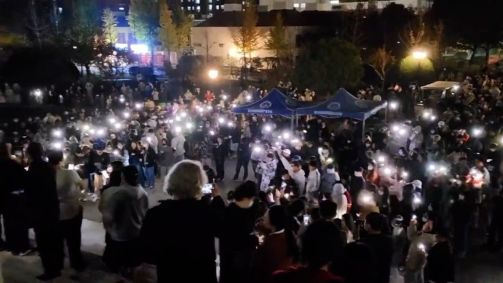 No final da noite de 27 de novembro, os manifestantes se reuniram às margens do rio Liangma, em Pequim, para lembrar pelo menos 10 pessoas mortas em um incêndio que consumiu o prédio trancado na cidade de Urumqi, no noroeste.