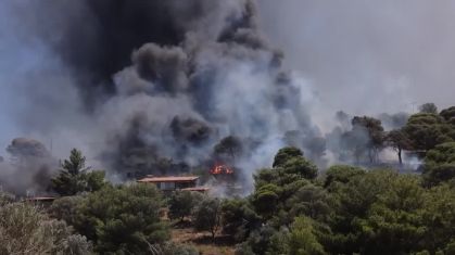 Dezenas de bombeiros com equipamento completo, apoiados por 23 aviões de transporte de água, lutaram com mangueiras para controlar um incêndio numa área escassamente povoada perto da cidade de Keratea, cerca de 35 quilômetros a sul de Atenas.