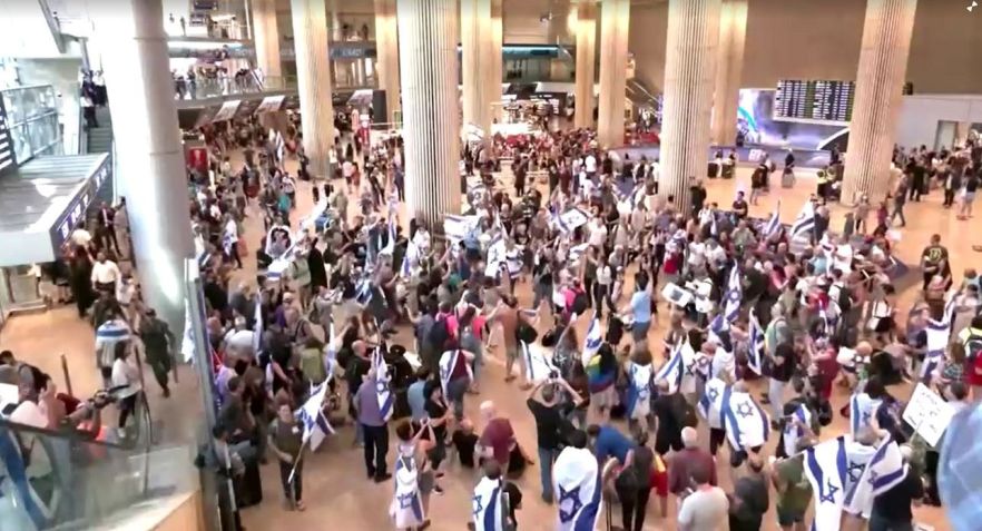 Um panfleto que circulou online convocava os manifestantes a irem a Ben Gurion com malas e passaportes, sugerindo que planejavam se passar por passageiros para contornar os cordões policiais.
