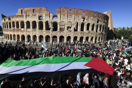 Na Itália, a onda de protestos chegou ao quarto dia consecutivo. Na capital Italiana, Roma, pessoas tomaram as ruas com faixas e bandeiras gritando "Palestina Livre", em uma marcha que, segundo organizadores, atraiu mais de 1 milhão de pessoas, enquanto a polícia estimou 250 mil participantes.