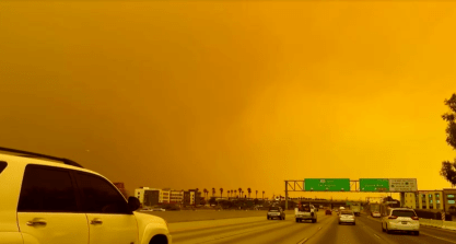 Imagens capturadas por pessoas que trafegavam por uma das rodovias de Los Angeles na quarta-feira (22) mostraram o céu da cidade laranja devido ao incêndio Hughes, queimando perto de Los Angeles, na Califórnia.