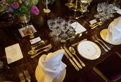 Cerca de 150 convidados participarão de um grande banquete de estado no Salão de São Jorge, no Castelo de Windsor. Escrito em francês, idioma habitual em jantares de Estado, o menu inclui: