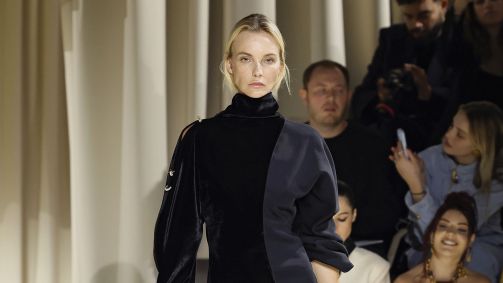 Carol Trentini desfila com look all-black da Schiaparelli em Paris